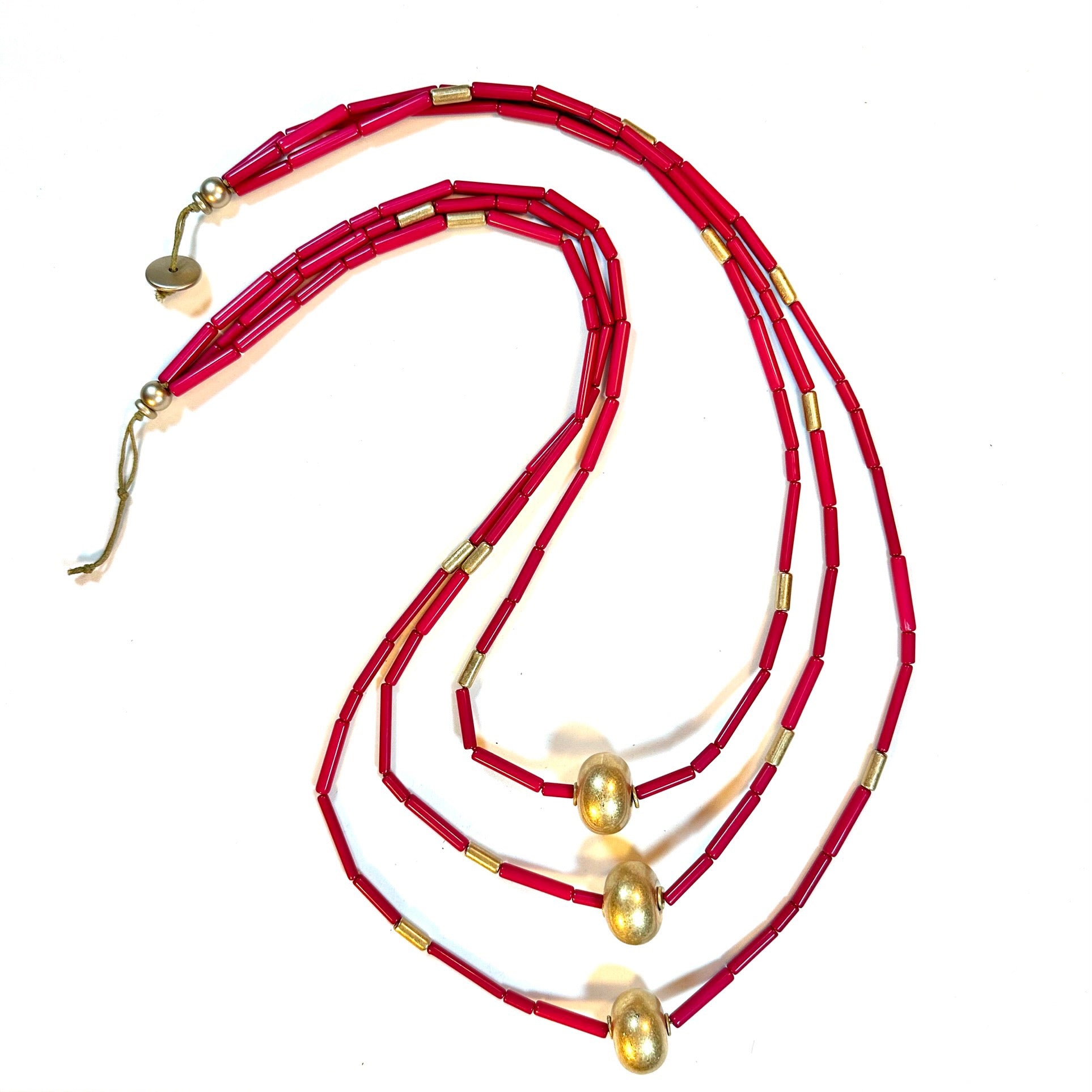 Collar largo tres vueltas tubos resina y bolas de metal, color fucsia