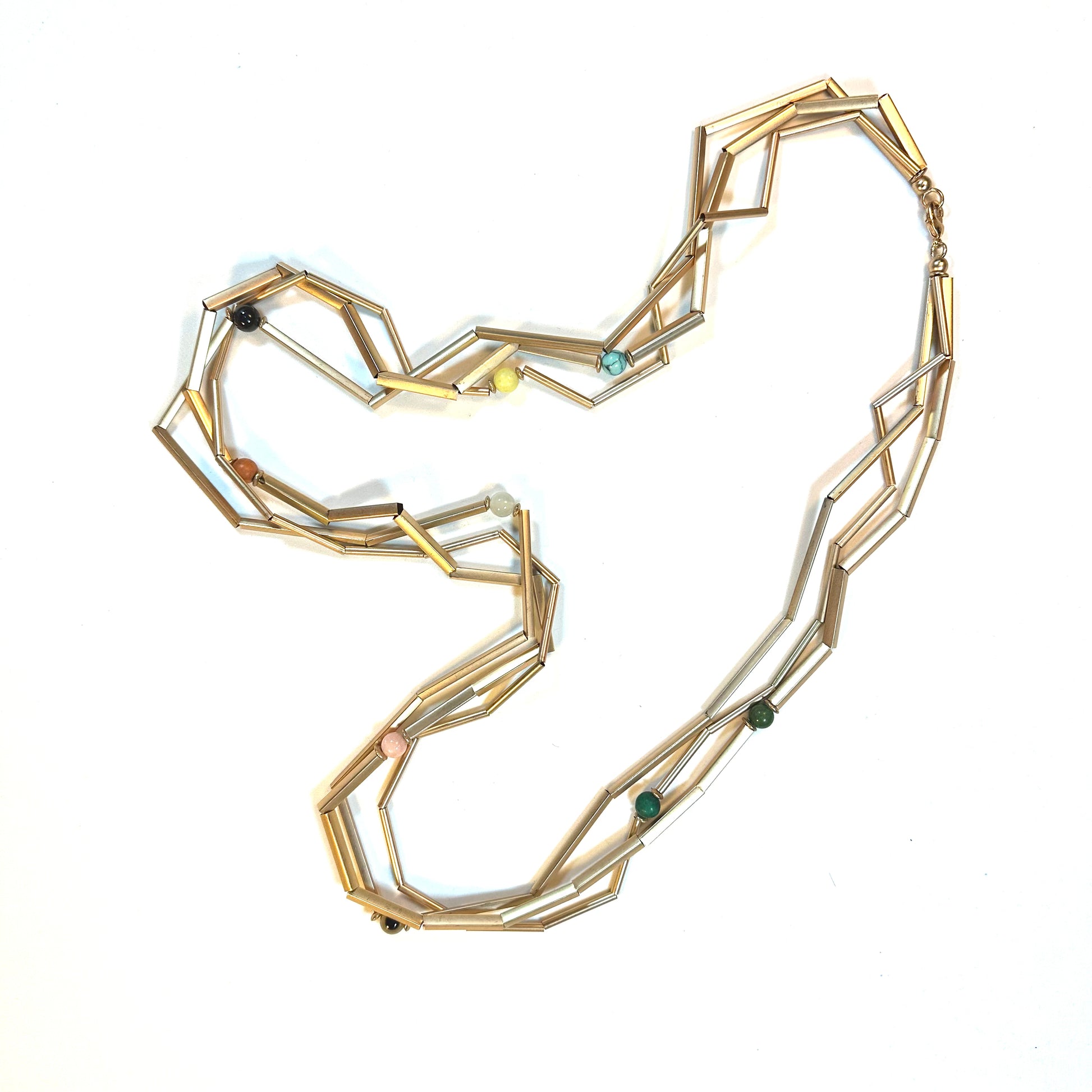 Collar largo tres vueltas cilindros metal oro y piedras naturales multicolor