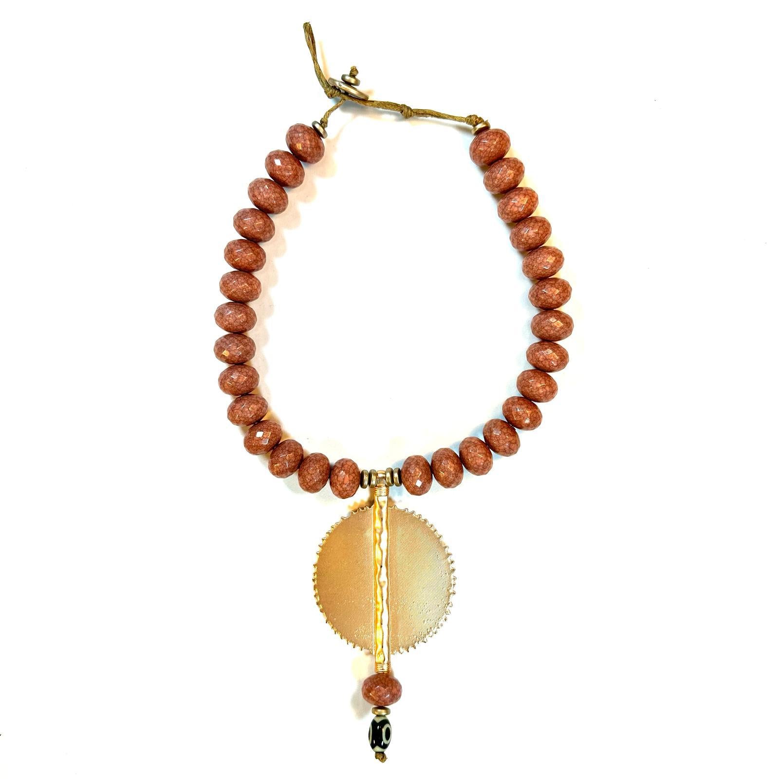 Collar corto bolas facetadas color coral oscuro y medallón metal oro