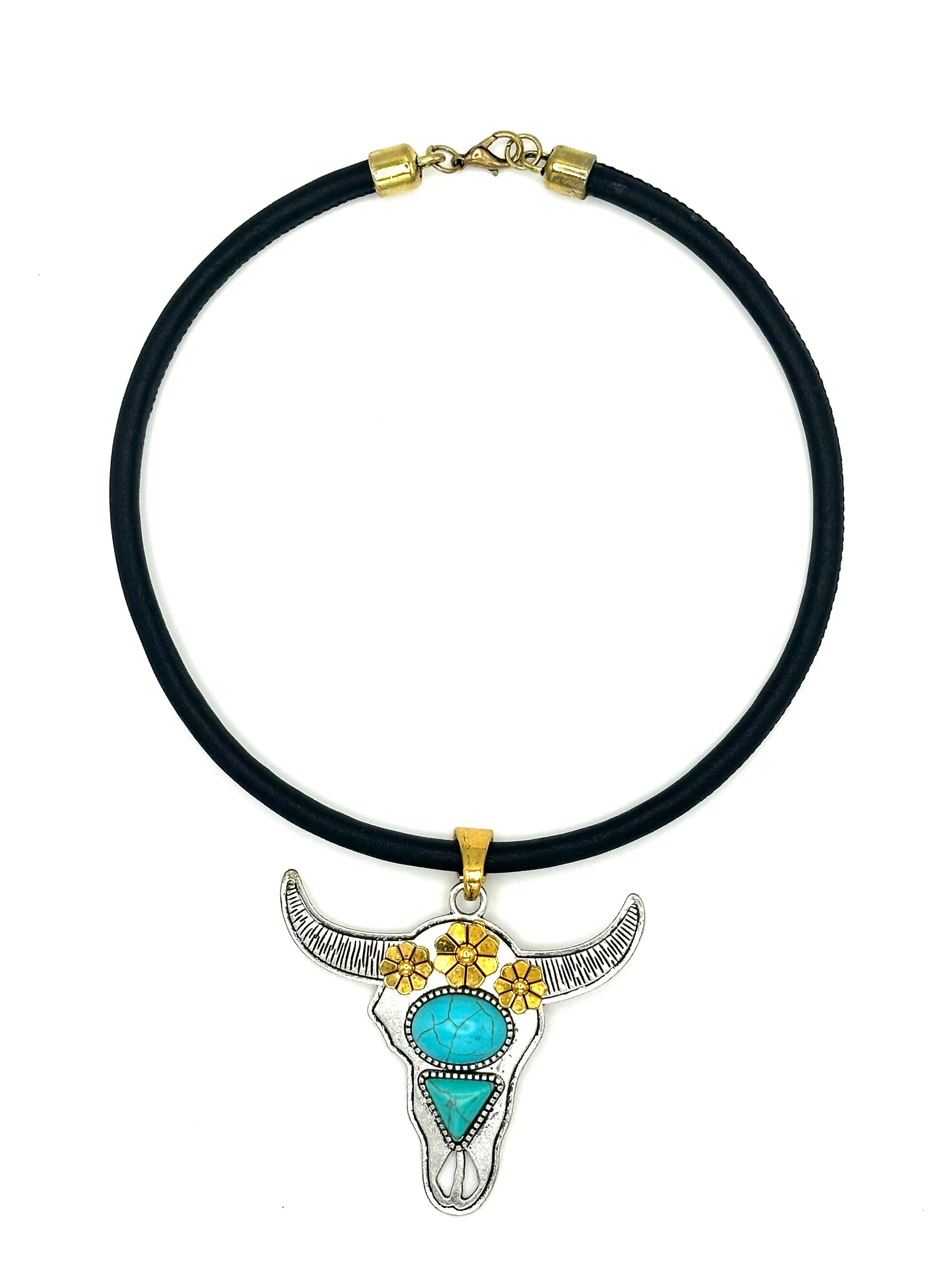 Golgante cabeza de buey con piedra color turquesa y cordon negro ecopiel