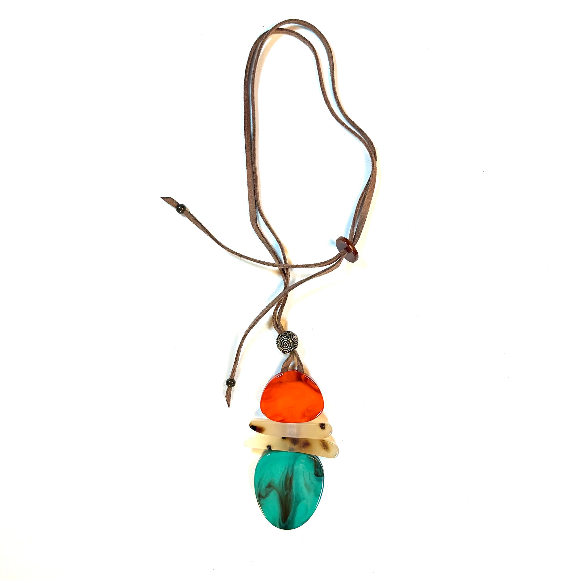 Collar largo ajustable con cordón de ante y tres piezas resina, color verde, beige y naranja