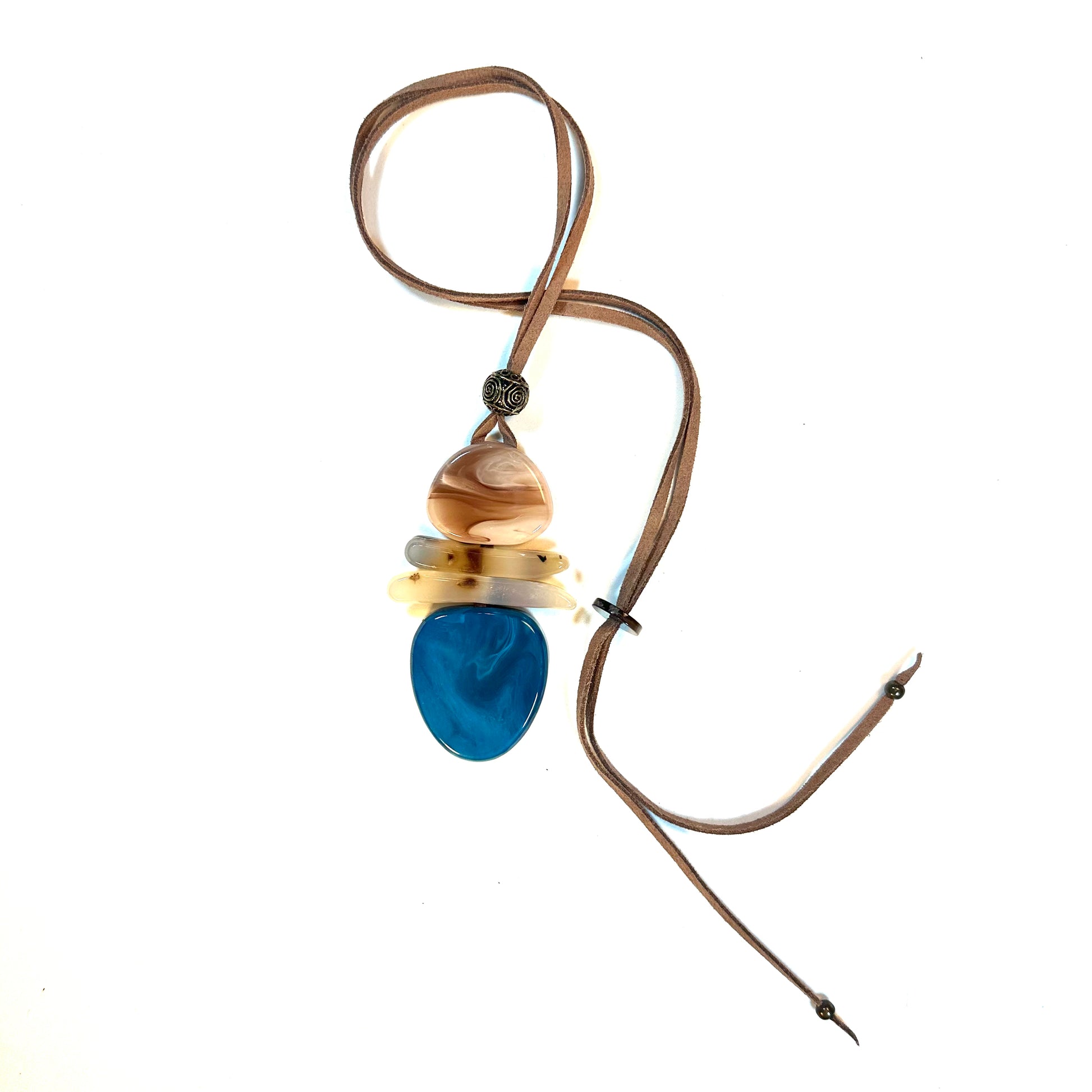 Collar largo ajustable con cordón de ante y tres piezas resina, color beige y azul