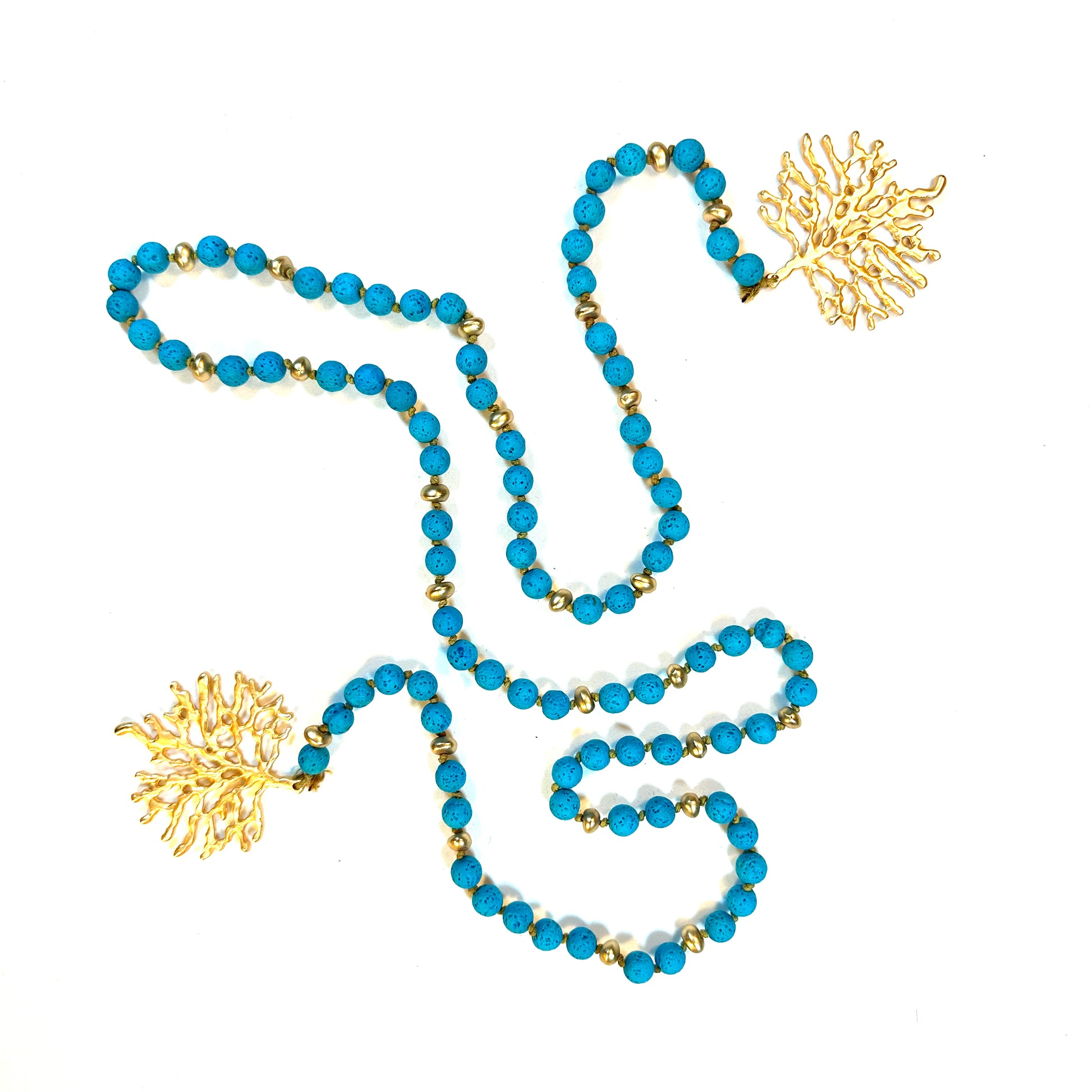 Collar largo bolitas volcánicas color turquesa, con corales metal oro, multiposiciones