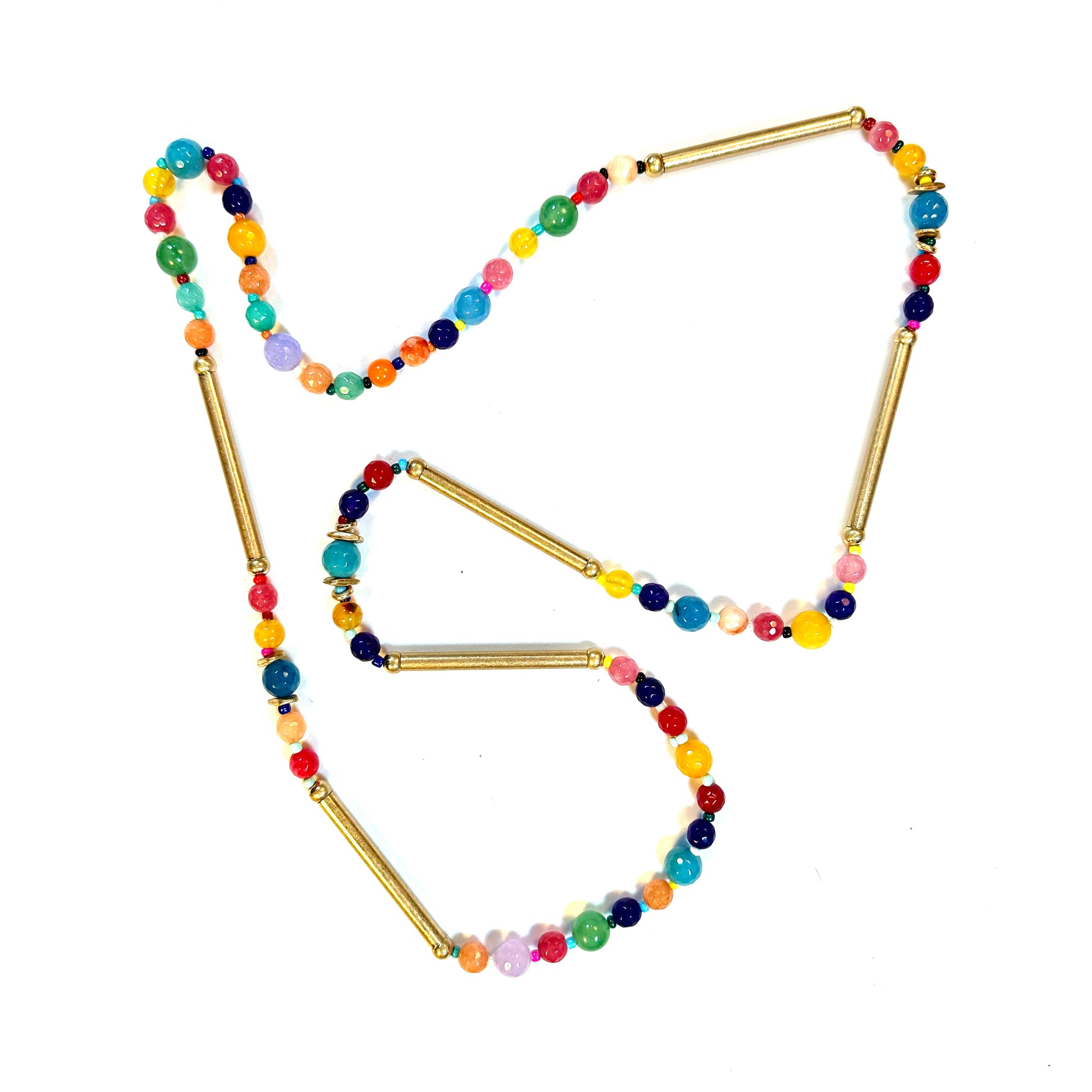 Collar largo ágatas naturales multicolor y cilindros metal oro